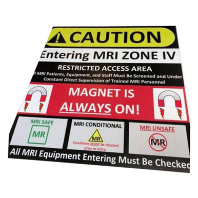 “Entering MRI ZONE IV” Floor Stickers warn patients and personnel that magnet is always on and all equipment must be checked. Warns you are entering MRI ZONE IV, Magnet is always on, MR Safe, MR Conditional, and MR Unsafe designations. Depicts entering restricted access areas and that all MRI Patients, Equipment, and staff must be screened and under constant direct supervision of trained MRI Personnel.