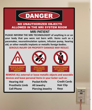 MRI Danger No Metallic Items 20” x 16.5” wide custom cut shape…