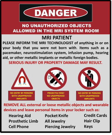 MRI Danger No Metallic Items 20” x 16.5” wide custom cut shape for any wall or door such as a locker room. This wall plaque is robust and has a washable Lexan surface. Adhesive back for convenience.