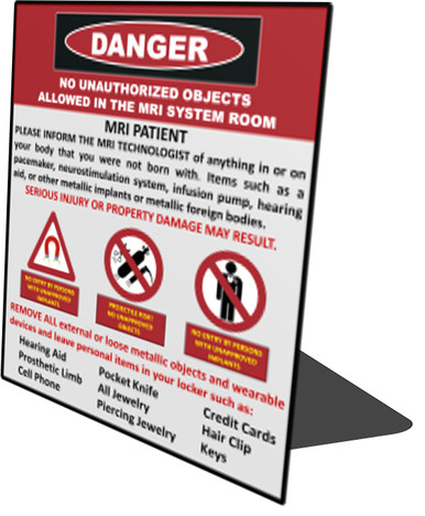 The MRI Warning Danger Check-In 12″ x 10″ sign is the first notice that warns patients of dangers of taking objects in to the MRI System Room. Comes as either a wall sign with adhesive or a free standing, L-shaped counter stand.